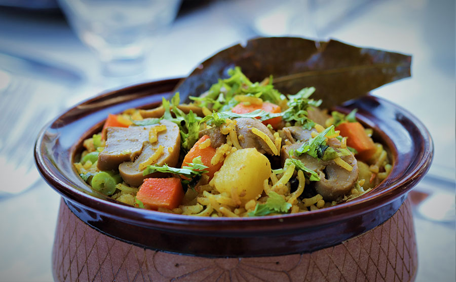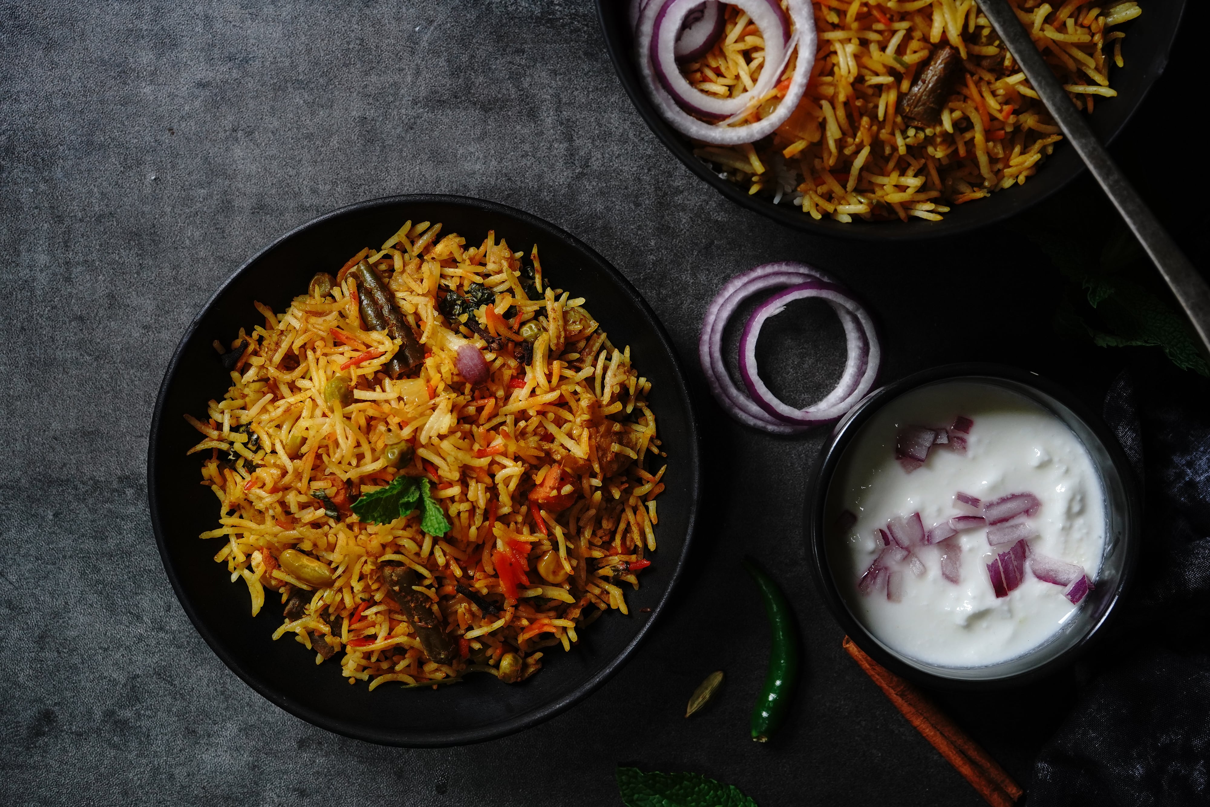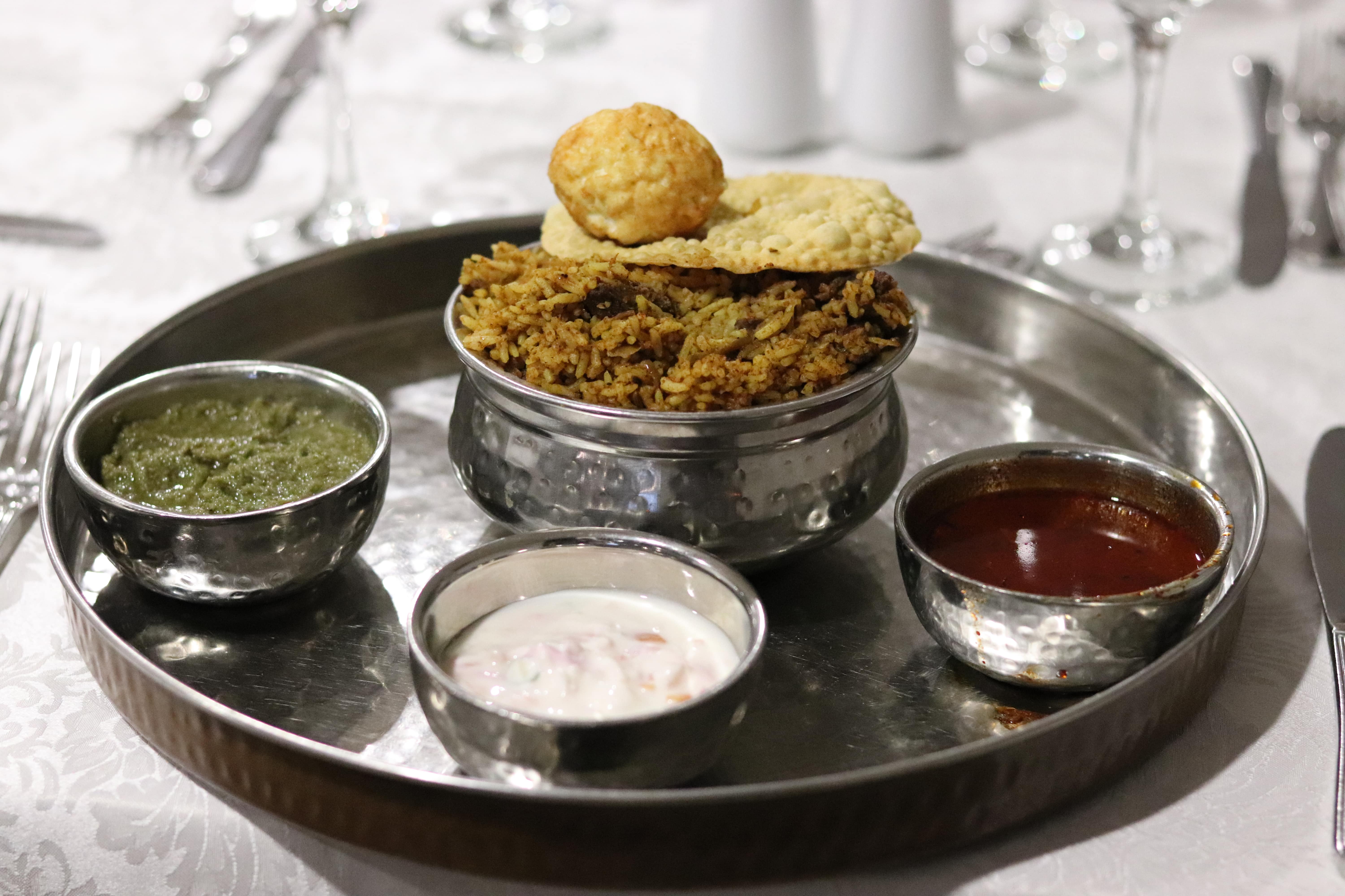 Served with raita, boiled egg, mint chutney, and spicy gravy.